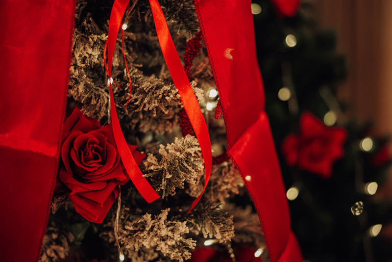 • Frosted Christmas trees dressed with rich red roses and satin ribbon