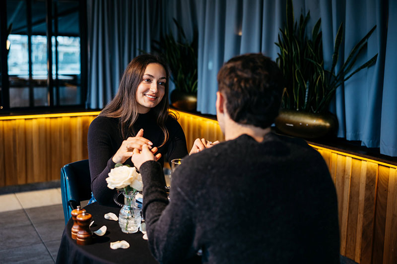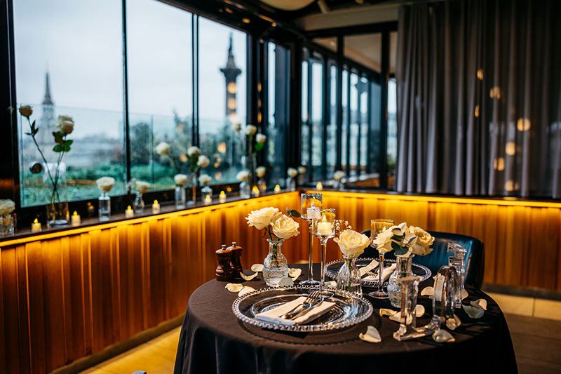 On the morning of the proposal, Ryan believed she was simply heading upstairs for breakfast. Little did she know that The One Romance team had already been in, quietly adding a touch of magic to the private dining room. We created an elegant walkway of fresh white roses placed softly around the room, leading the eye towards the incredible view. The table setting was refined and understated, perfectly in keeping with Joe’s vision. At first, Ryan simply thought it was a beautifully decorated room, unaware of what was about to unfold.