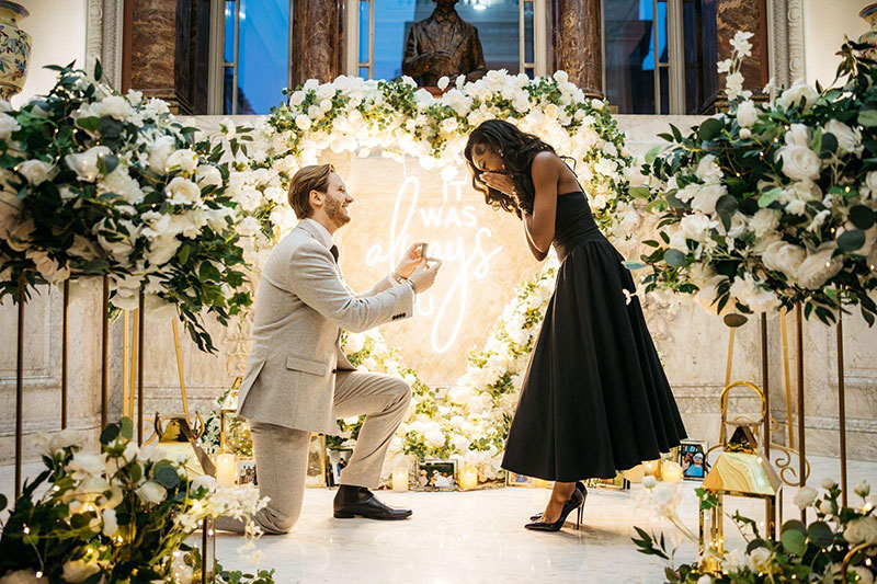 Your proposal story should start with a realistic reason to get your partner to the location. We’ve seen clients invite their partners to “a work dinner,” “a friend’s birthday,” or “a wine tasting”. (One of our recent favourites was the partner who thought she was attending a client event, only to walk into a ballroom filled with flowers and the words It Was Always You.)